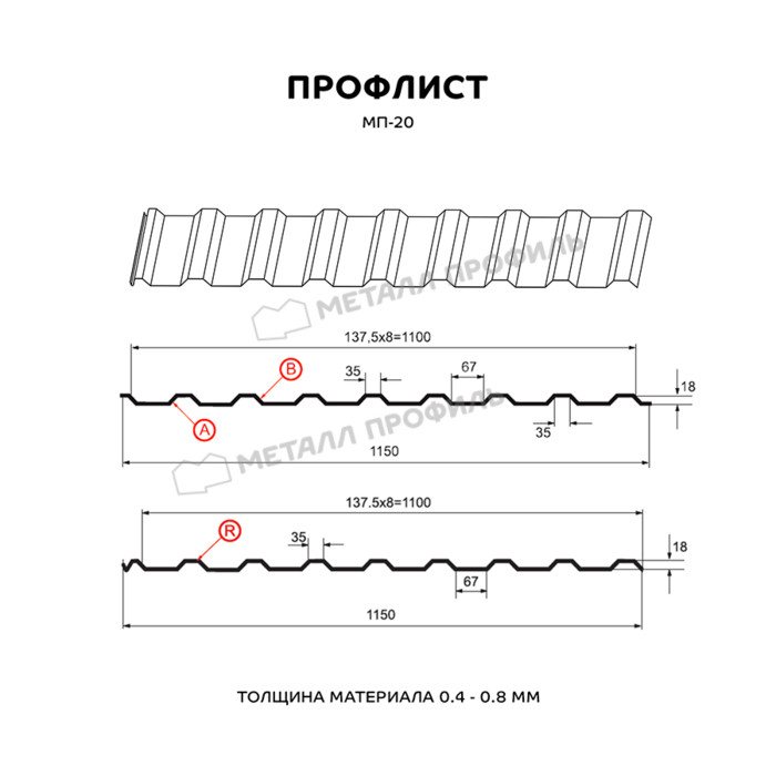 Весьма популярный в Кузнечном профнастил с небольшой высотой трапеции – 18 мм. Указанная в названии маркировка 20 – лишь округлённое число точного размера. Большой выбор толщин, в которых выпускается МП-20, а также его прочностные качества позволяют применять такой профнастил в самых различных областях. Металлопрокат 0,35-0,4 мм подойдёт для обшивки внешних стен, поскольку имеет больше декоративную функцию. В данном случае имеет значение лёгкий вес и финишное покрытие, придающее цвет и текстуру изделию. Для обустройства кровли лучше использовать металлопрокат с толщиной от 0,5 мм – он жёсткостью, чтобы выдерживать снег и сильные дожди. Для установки ограды оптимальным вариантом будет профлист толщиной 0,4-0,5 мм. Более толстый профиль выбирается уже для стеновых перекрытий в нежилых помещениях, для постройки каркасных сооружений (киосков, павильонов, гаражей).