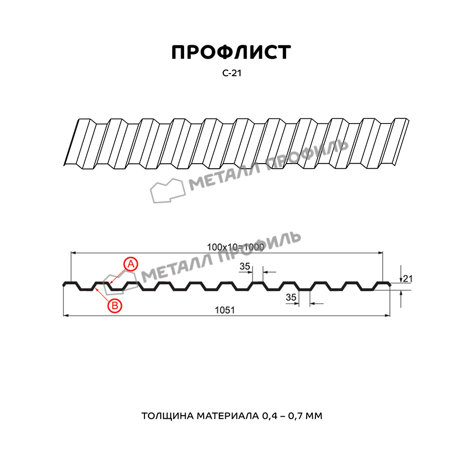 Профилированный лист С-21х1000-B (ПЭ_МА_Д-01-8017-0,4) часто используется в Кузнечном для монтажа забора. Изначально он представляет собой стальной оцинкованный лист с покрытием. Толщина стальной основы с оцинковкой и полимерным покрытием — 0.4 мм. Проходя процедуру холодного проката, металл приобретает рисунок из ритмичных волн. Такая форма придает профилю несущую способность.